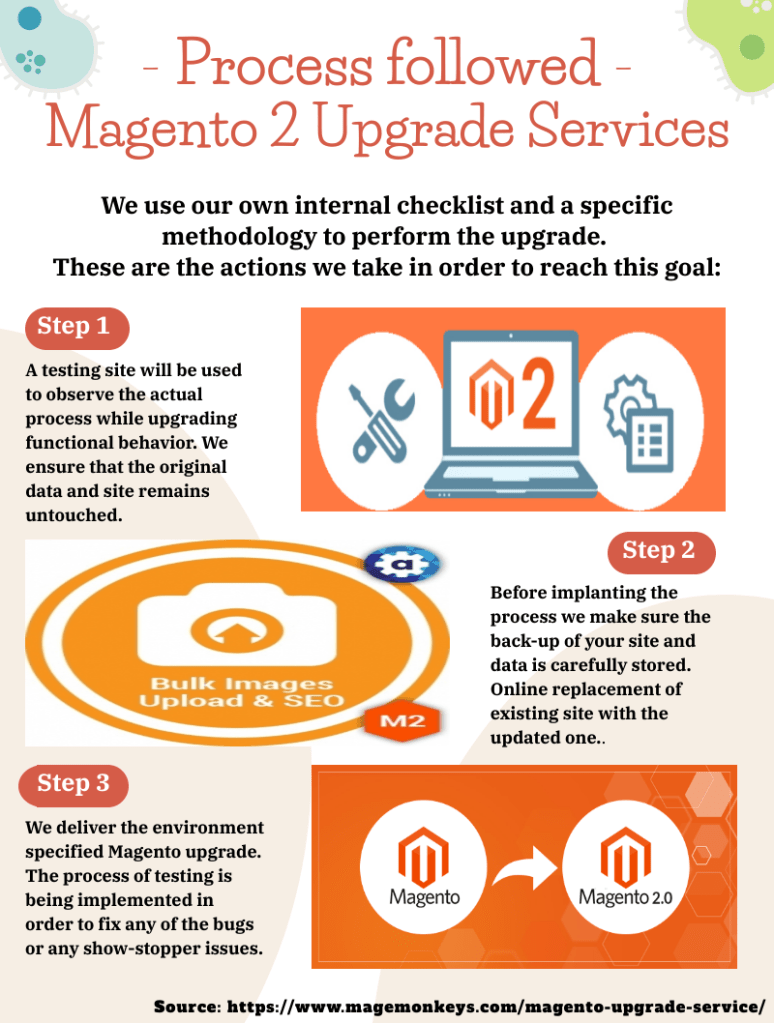 Here is the Image shows you whats is Process of Magento 2 Upgrade Services and We use our own internal checklist and a specific methodology to perform the upgrade.